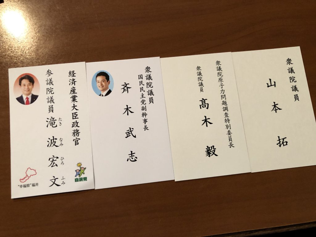 激励に来ていただいた国会議員のかたの名刺です。